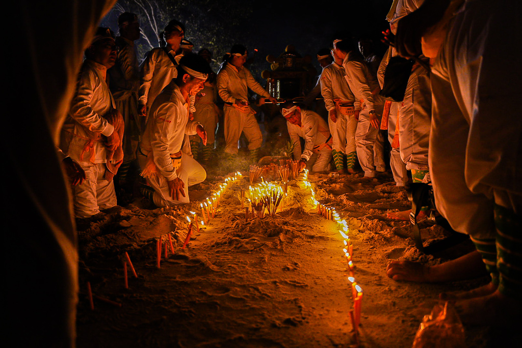 Along Singapore’s East Coast, hundreds dressed in white stand in stillness, their faces lit by lantern glow and moonlight. The sea is dark, restless. From the horizon comes the steady beat of drums—low, insistent—and the glint of yellow silk. Covered palanquins emerge from the water, swaying on the shoulders of barefoot carriers. Curtains ripple in the sea breeze, concealing what they bear. Chants rise, incense thickens, and the crowd leans forward. The Nine Emperor Gods have returned from the Heavenly River, crossing through tide and night to walk among mortals once more.