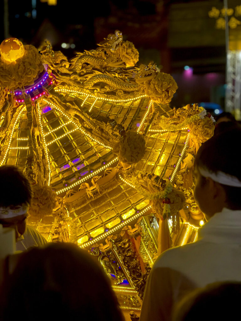 The Nine Emperor Gods travel in enclosed palanquins, each one a moving sanctum. Attendants shield them with flags, umbrellas, and silk screens, for to see them openly would diminish the mystery and reverence that surrounds them. When sacred objects are placed inside, the exchange is done swiftly and discreetly. An unspoken pact between heaven and earth that the holy shall remain veiled.