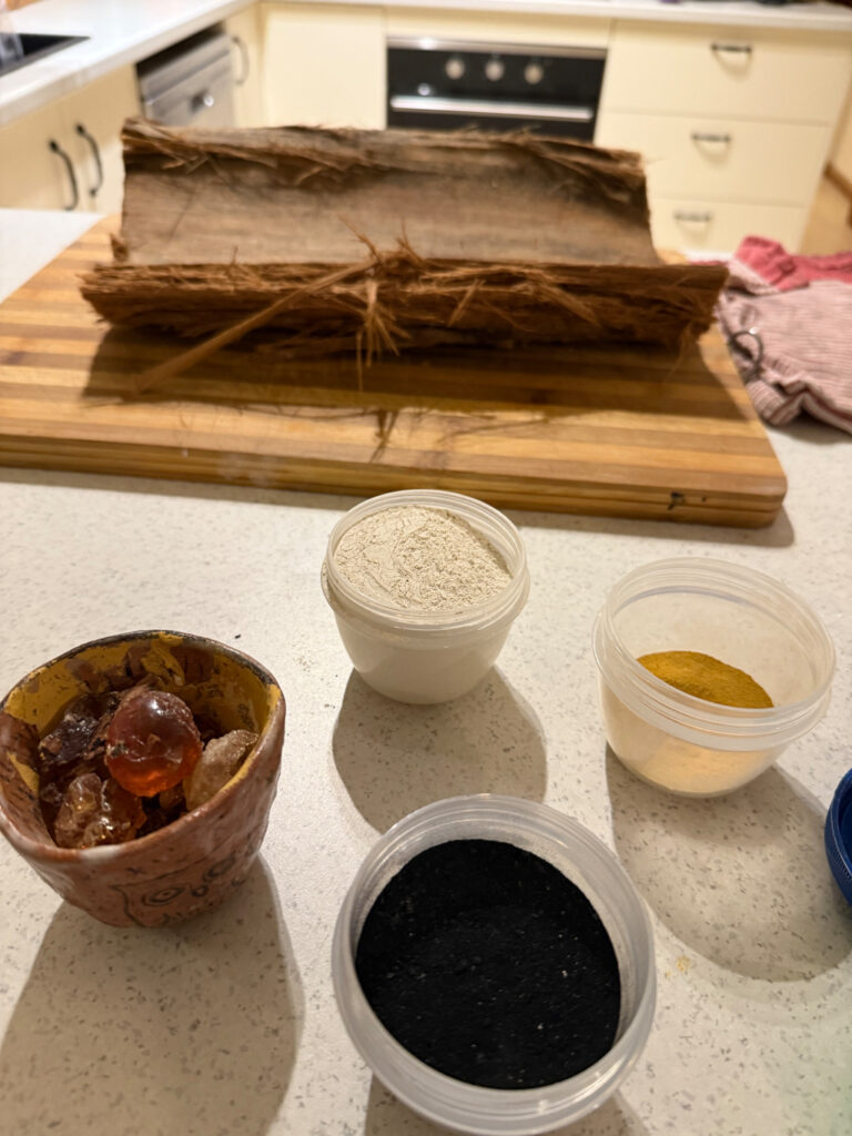 - Stringy bark, painted in charcoal and wattle resin. White and yellow ochre, with riverbed clay/mud. The black background is ground charcoal mixed with resin (wattle sap).