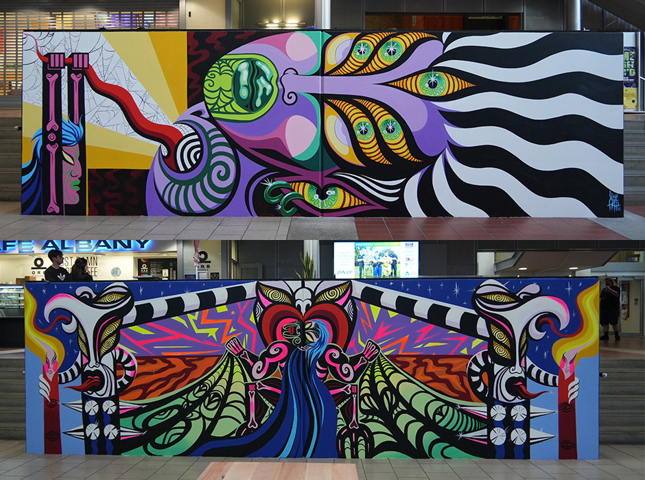 - Xoë Hall (Kāi Tahu, Te Rakiamoa, Ngāi Te Ruahikihiki) “Realms of Wisdom”, Ōtago Uni Tāwhiki mural, 2024